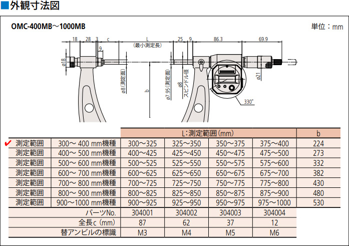 替アンビル式外側マイクロメータ OMC-400MB【ミツトヨ】の仕様